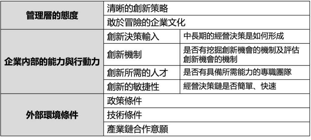 那麼,要怎麼去判斷一家公司有良好的創新基礎和條件呢?我個人認為有三個主要的方向:1)管理層的態度、2)企業內部的能力與行動力,以及3)外部環境帶來的條件